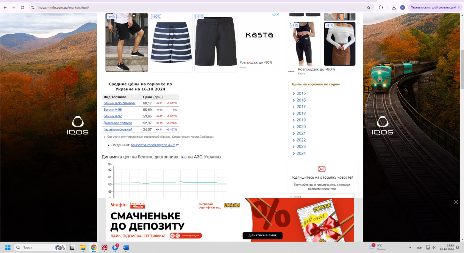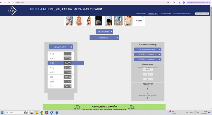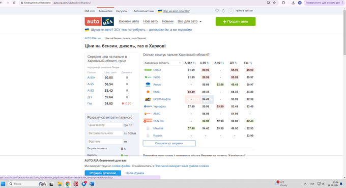 Станом на 16.10.2024 року отримано роздруківку щодо середніх цін на пальне на заправках міста Харкова та Харківської області, а саме: